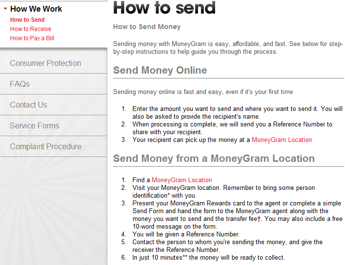 MoneyGram is a service available for people who, whether online or in one of MoneyGram's many stores, wish to send money to others over long distances. The availability of the online services, however, are only available to residents of the United States/United Kingdom/Australia/Canada/France/Germany/India/Italy/Mexico/Philippines/Russia/Spain.
