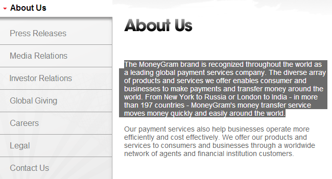 "MoneyGram is a global leader in worldwide money transfer services, working closely with specially chosen agents in 162,000 locations across 197 countries and territories."