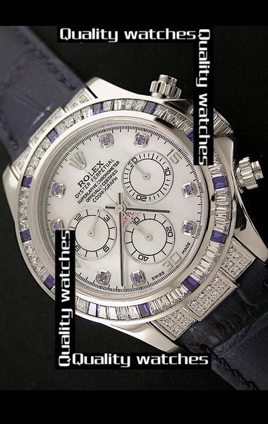 Watch Dial: White, Blue Diamonds time markers, Three functional White Subdials, Functional Chronograph